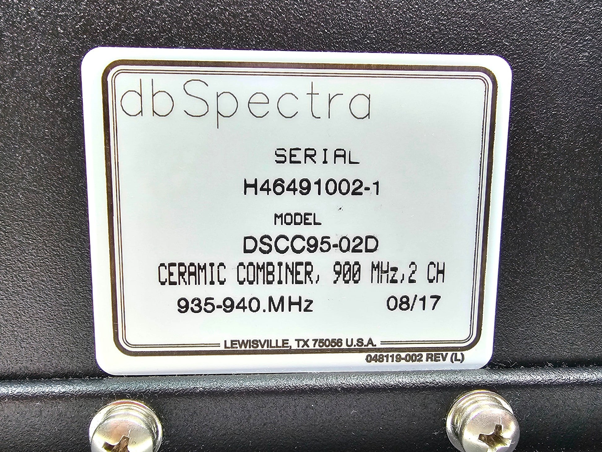 DbSpectra DSCC-Series Transmit Cavity Combiner, 935-940 MHz, 2 Channel, model: (DSCC95-02D). Units are in great condition and are guaranteed fully operational. If you have any questions, please contact us. Office hours: (M-F: 8am-4pm) MST.