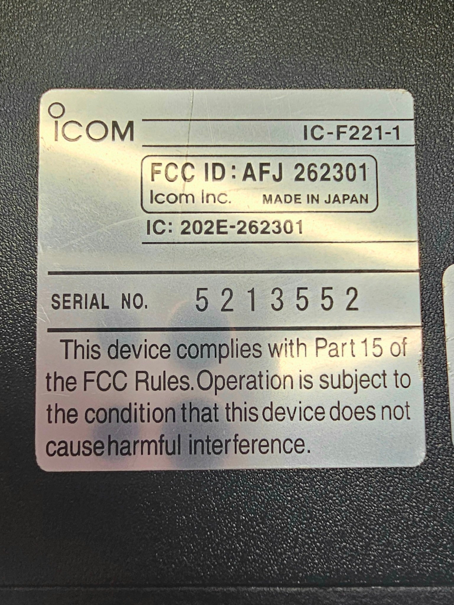 Icom IC-F221-1 UHF radio. This is a 45watt, 128 ch radio with a band split of 440-490. Radio is in excellent shape and guaranteed fully operational. Comes complete with palm mic, mounting bracket and power cable. These radios are capable of narrow band operation. Free programming is available (1-16). If you have any questions please contact us, Mon-Fri (8am-4pm MT).