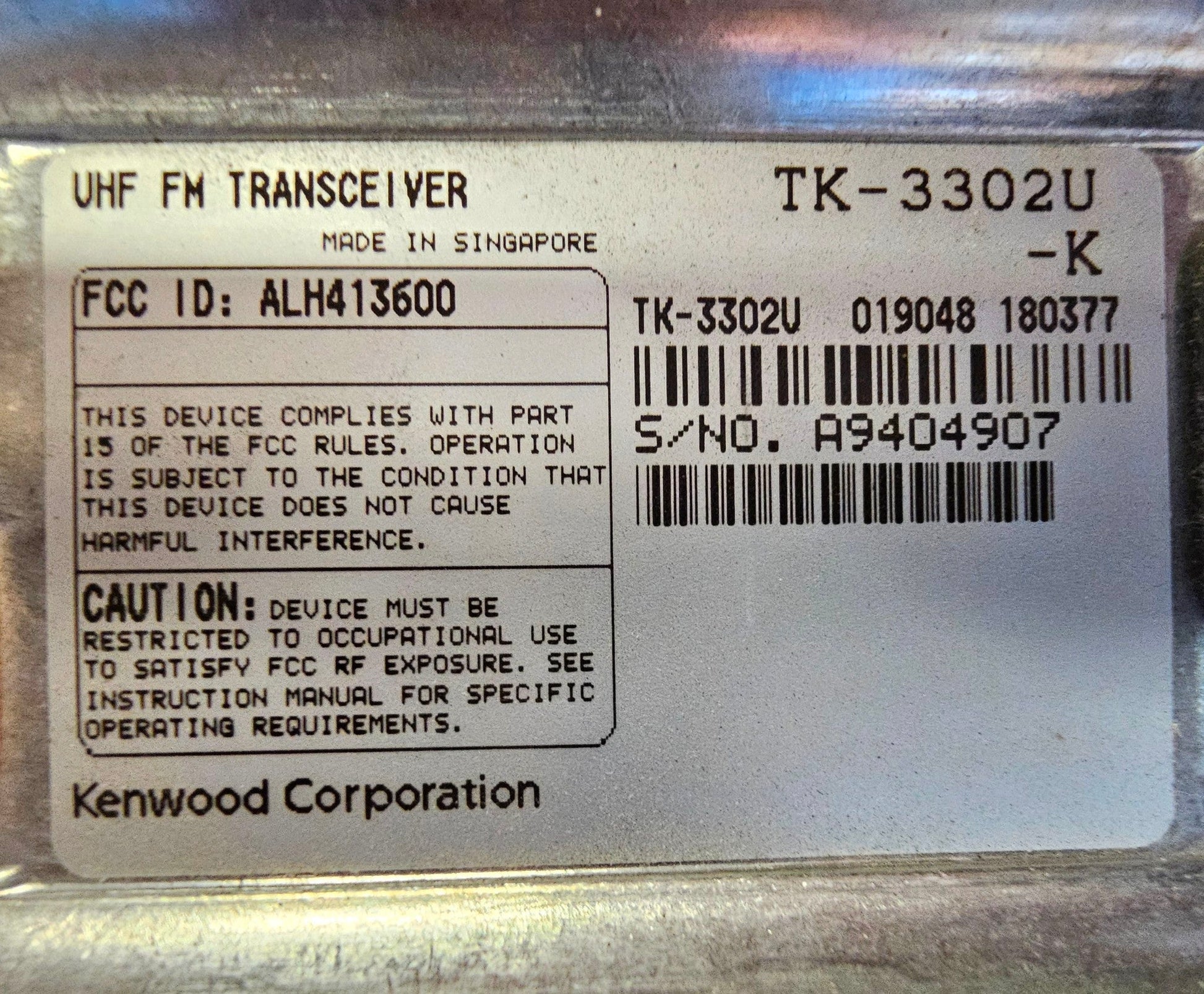 Kenwood TK-3302U UHF ProTalk radio. These are 4 watt, 16 channel radios with a band split of 450-490 MHz. Units come complete with antenna, battery, belt clip and charger. Free programming is available (Up to 16 Channels). If you have any questions please contact us (M-F, 8AM-4PM) Mountain Time.