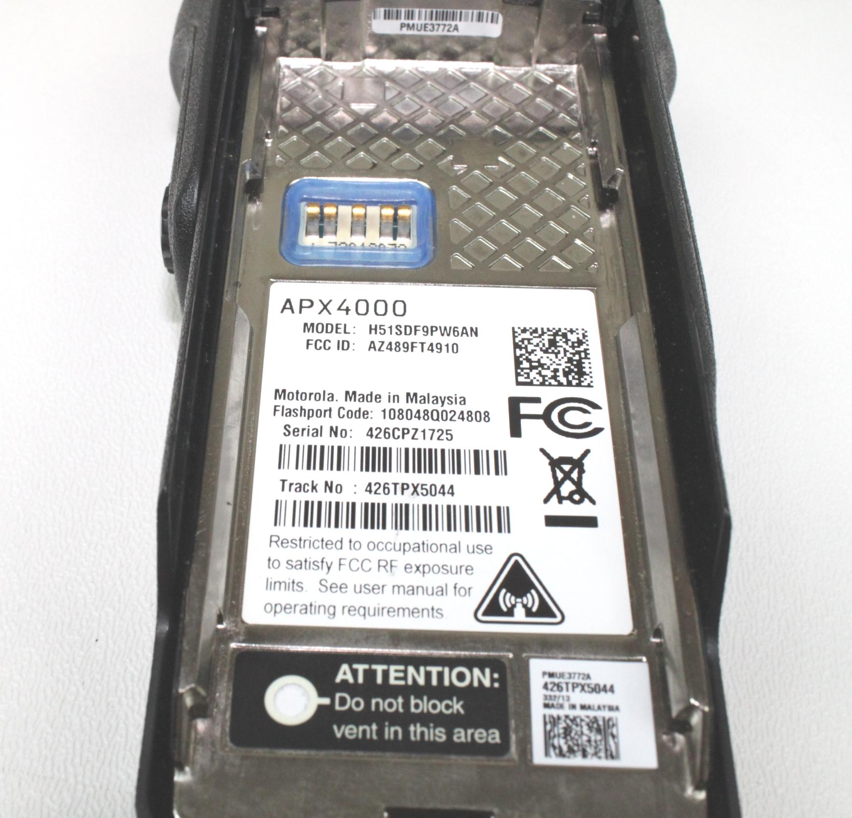 Motorola APX 4000 900 MHz (896-940) MHz Model 3 512 ch 5W single knob portable Radio (Model H51WCH9PW7AN). Radio is excellent condition and comes complete with Impres Battery/Clip, GPS Antenna, and Impres Charger. Flash code information is listed below. Please contact us with any questions.
