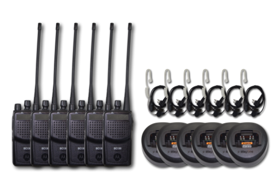 Kit includes: (6) BC130 Radios, (6) Chargers w/ adapters, (6) Batteries, (6) Antennas, (6) In-ear surveillance mics & up to (16) channels programmed for no extra charge.