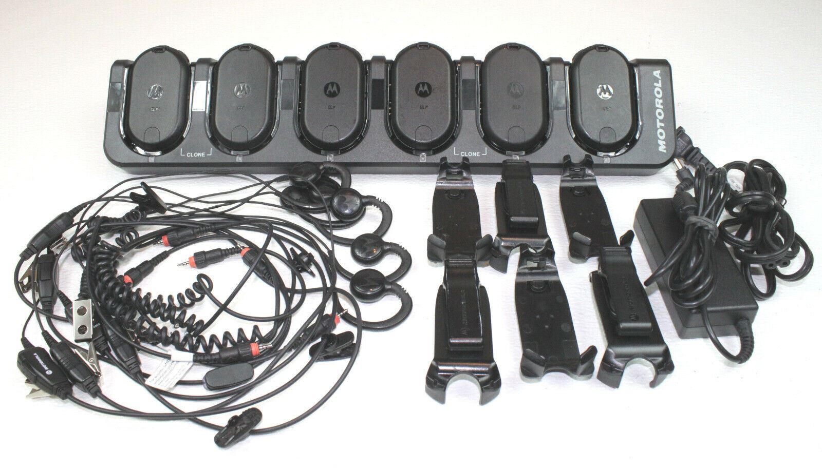 Motorola CLP1040 UHF 4 Ch Radios 6-Pack w/ Bank Charger, Earpieces & Holsters