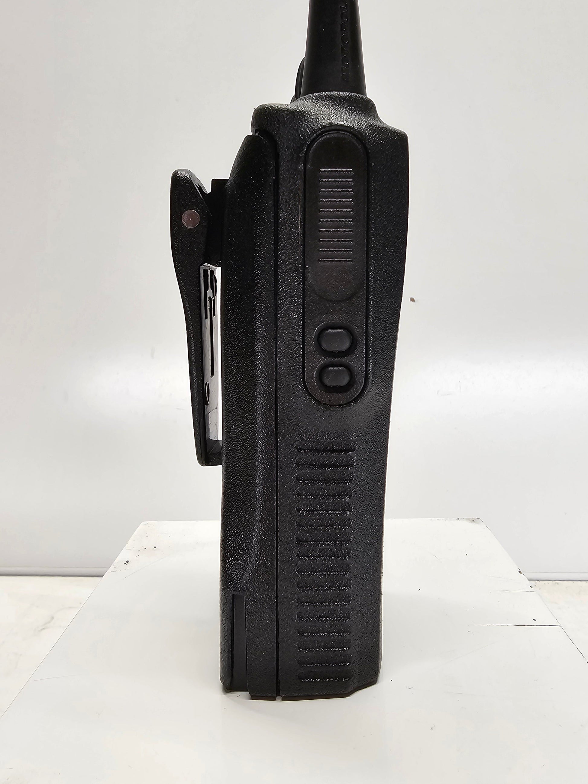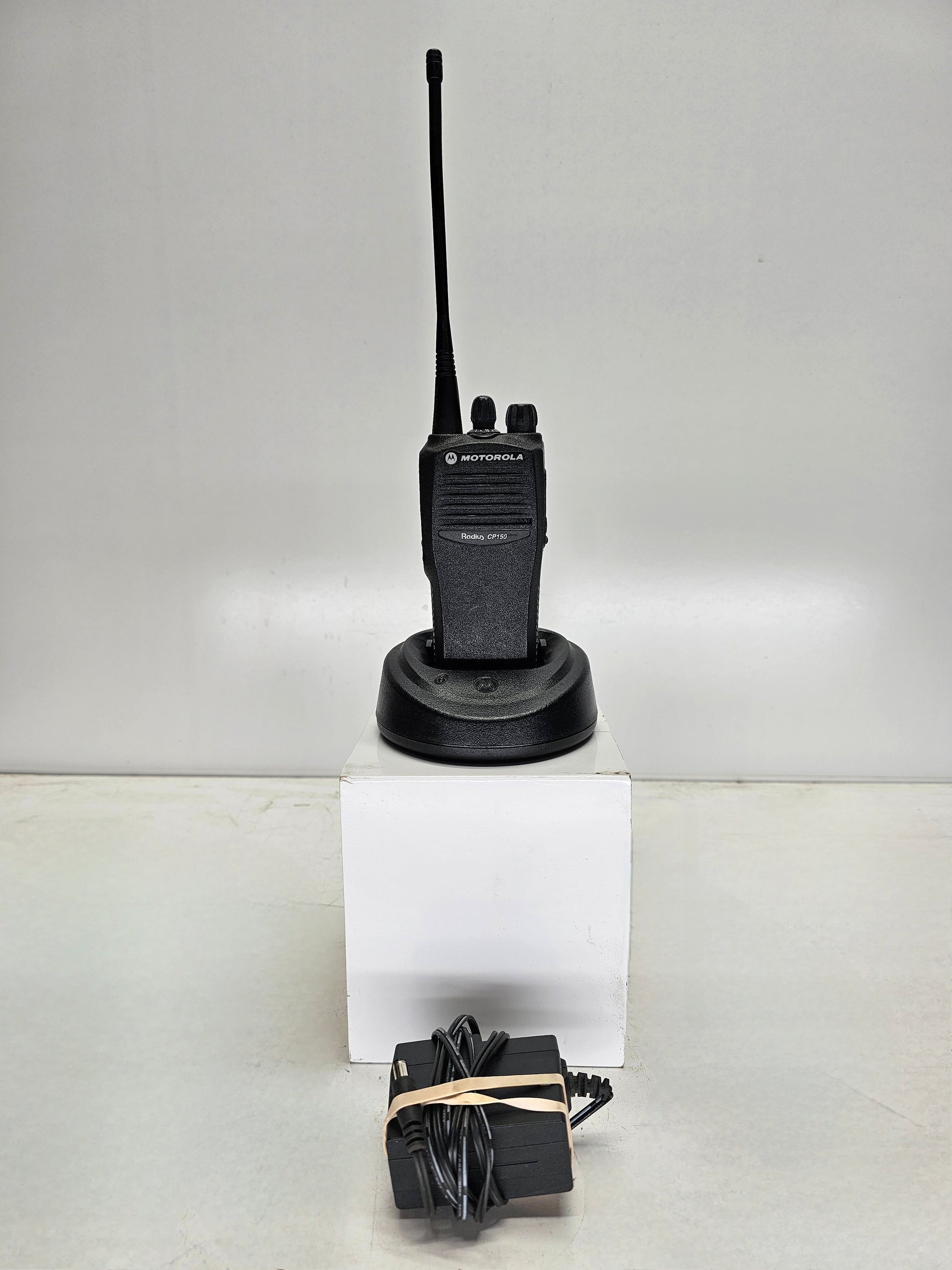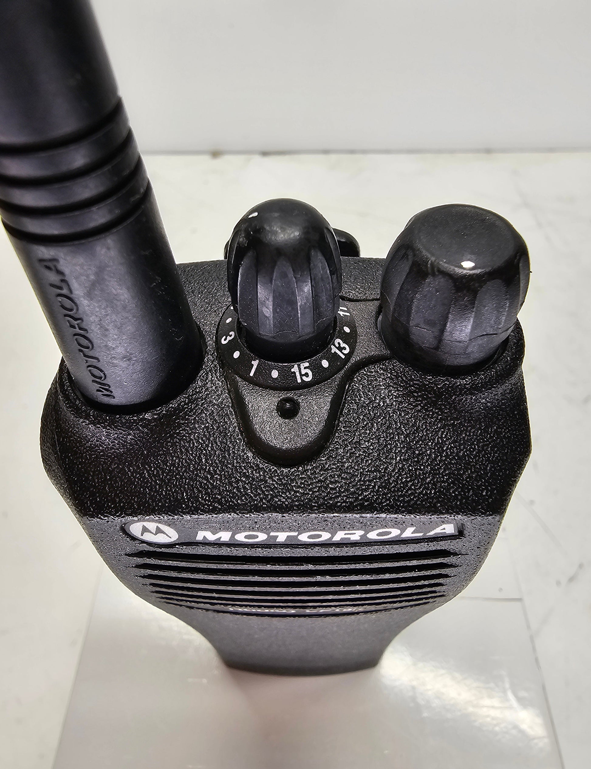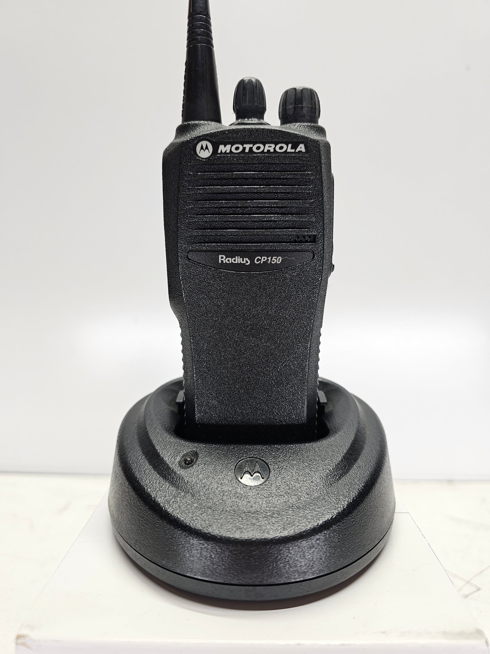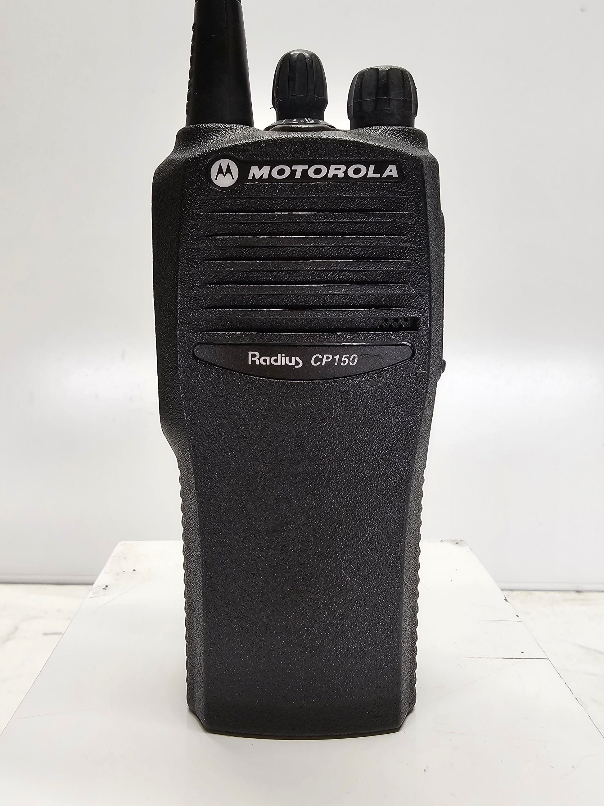Motorola CP150 UHF radio, model number AAH50RCC9AA2AN. This is a 2 watt, 16 channel radio with a band split of 438-470 MHz. Units are in excellent shape and are guaranteed fully operational. Free programming is available (up to 16 channels). If you have any questions please contact us.