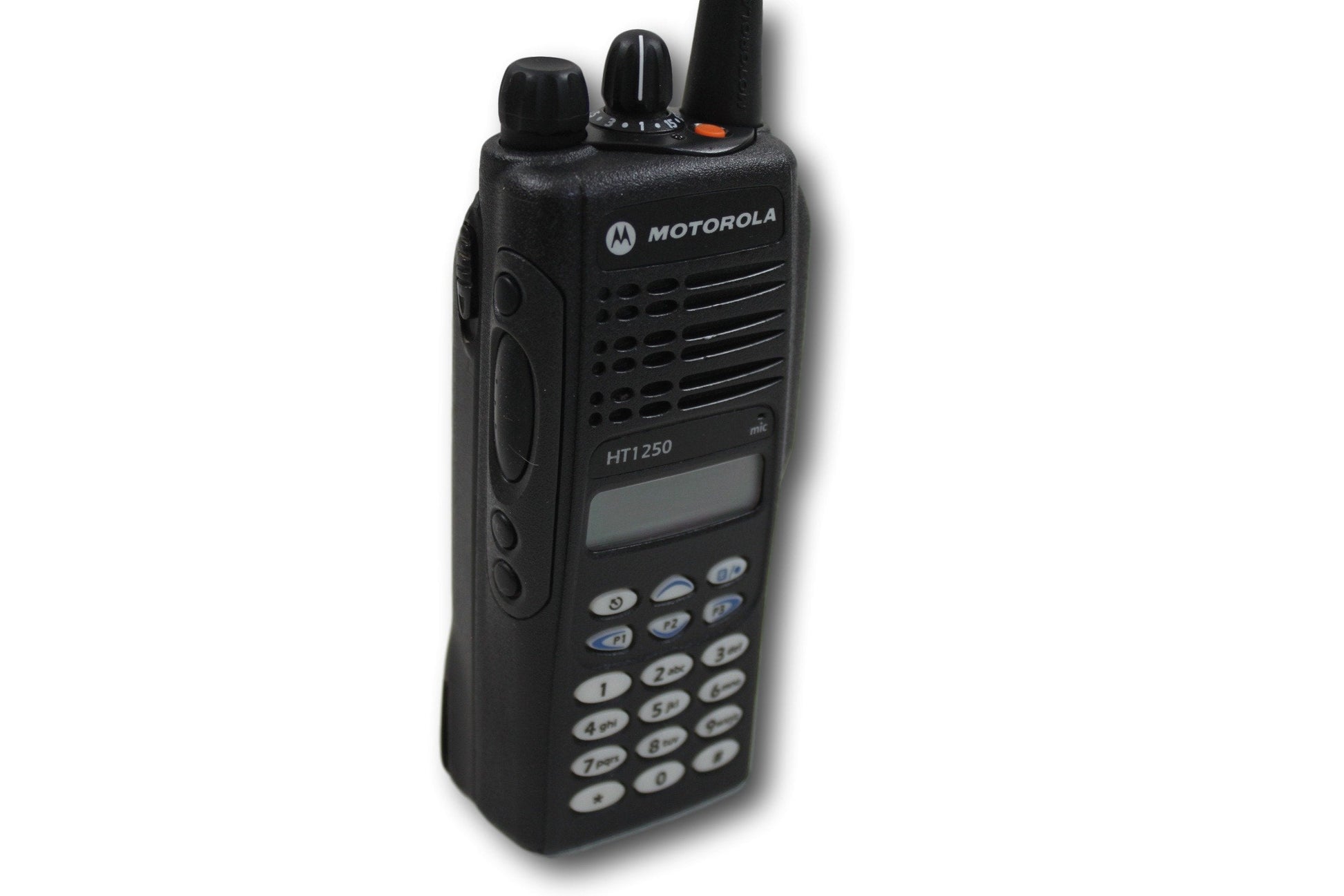 This is a Motorola HT1250 VHF portable radio AAH25KDH9AA6AN. This model features a full keypad. Unit comes complete with battery, belt clip, antenna, and rapid charger.