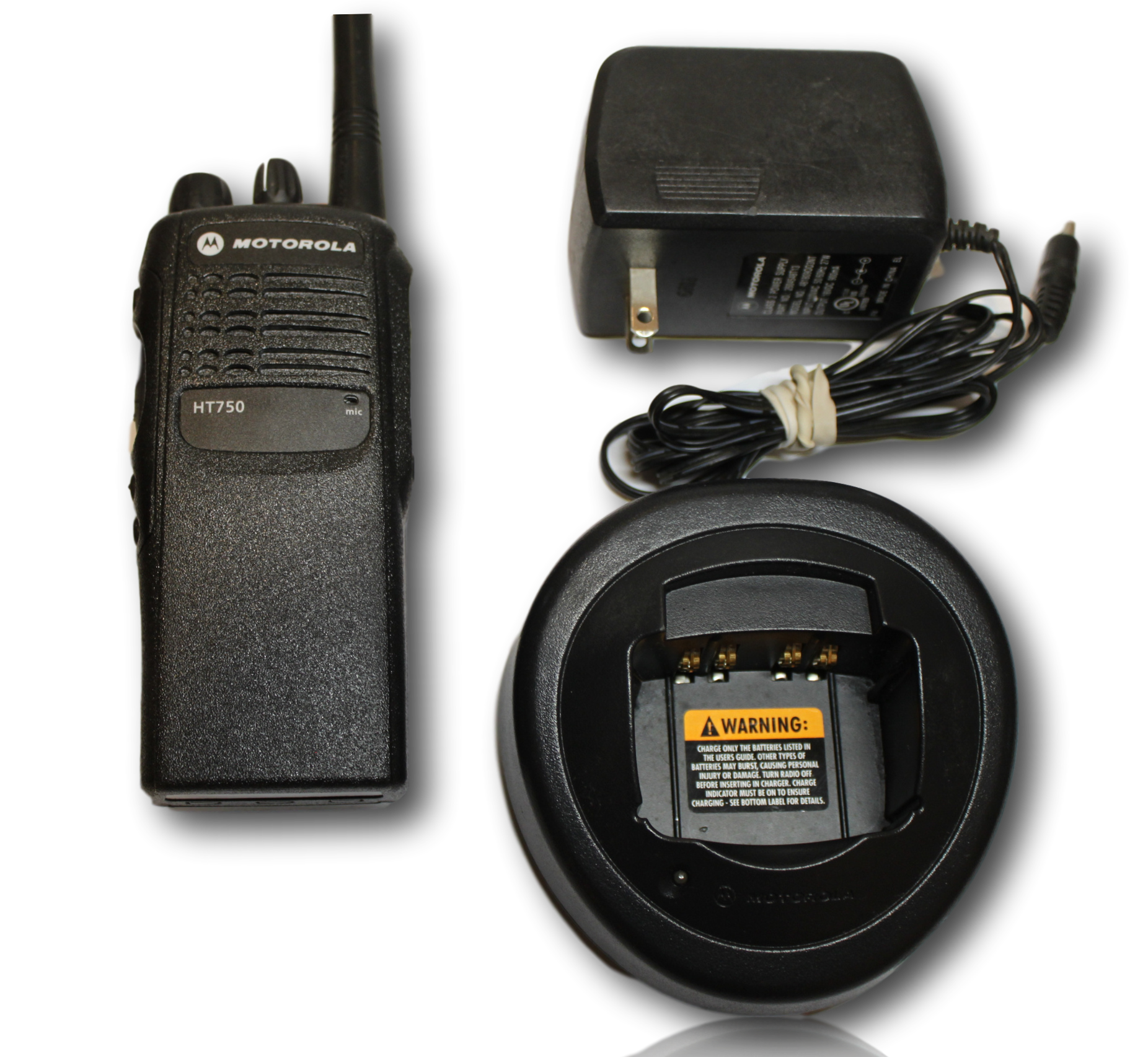 This is a Motorola HT750 Low Band portable radio. Unit comes complete with battery, belt clip, antenna, and rapid charger.