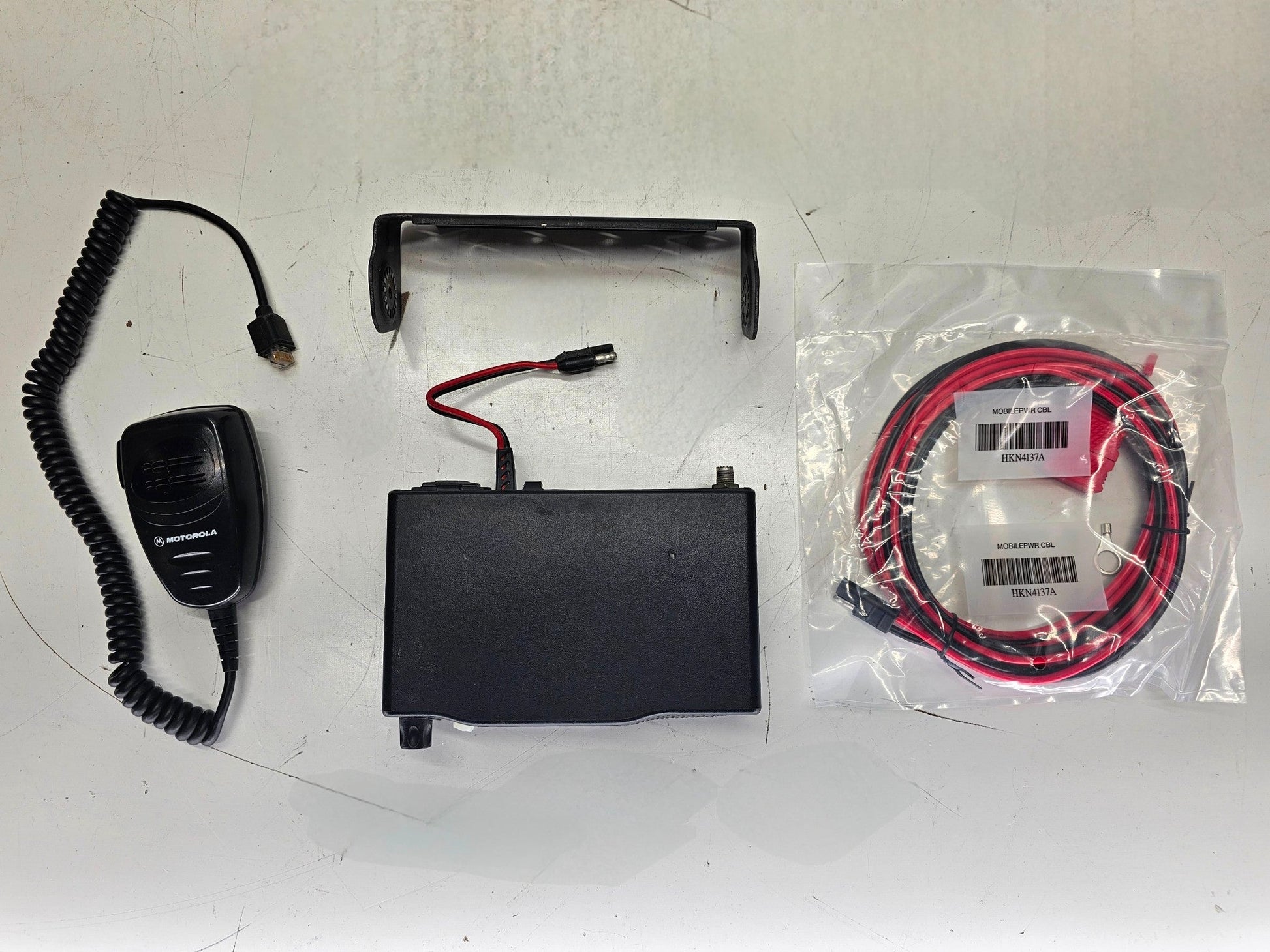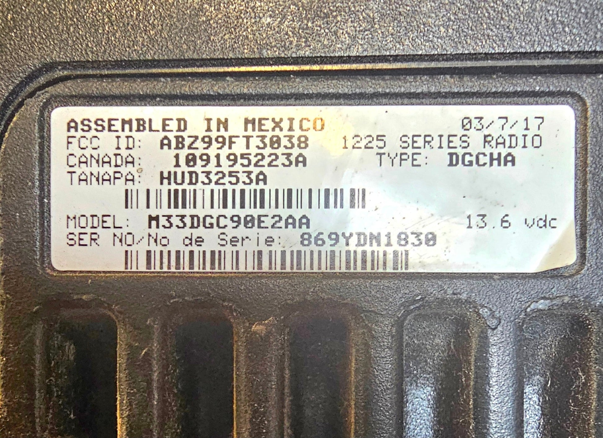 Motorola M1225 VHF mobile, model number M33DGC90E2AA. This is a 4 channel, 25 watt radio with a band split of 150-174 MHz. Unit comes with palm mic and mounting bracket. Radio is in excellent shape and guaranteed not DOA. Free programming is available. If you have any questions please contact us.