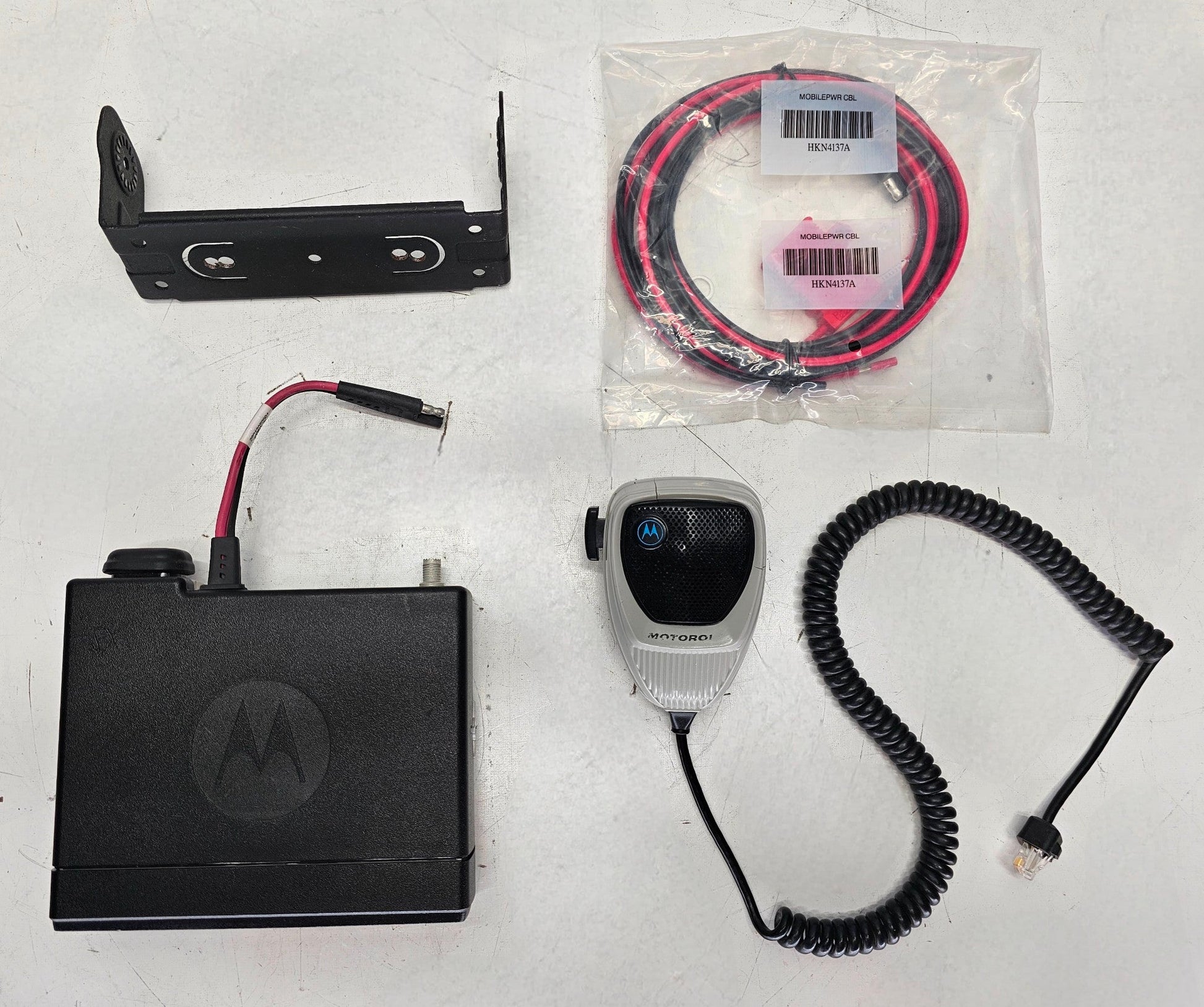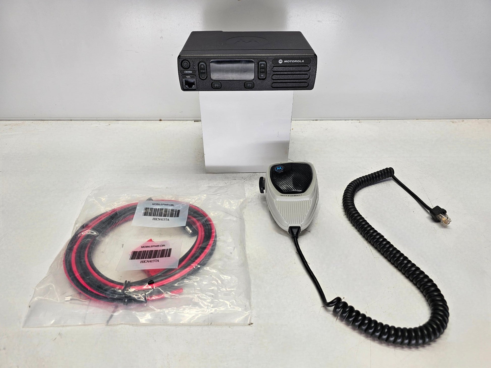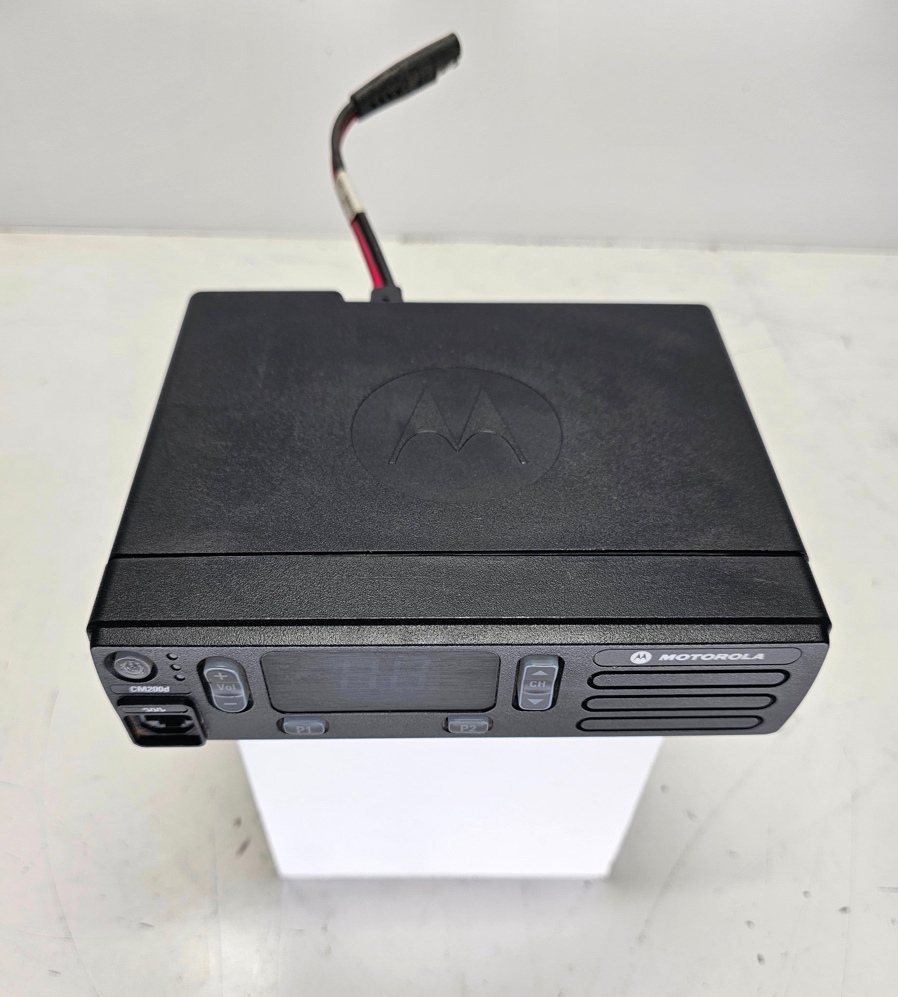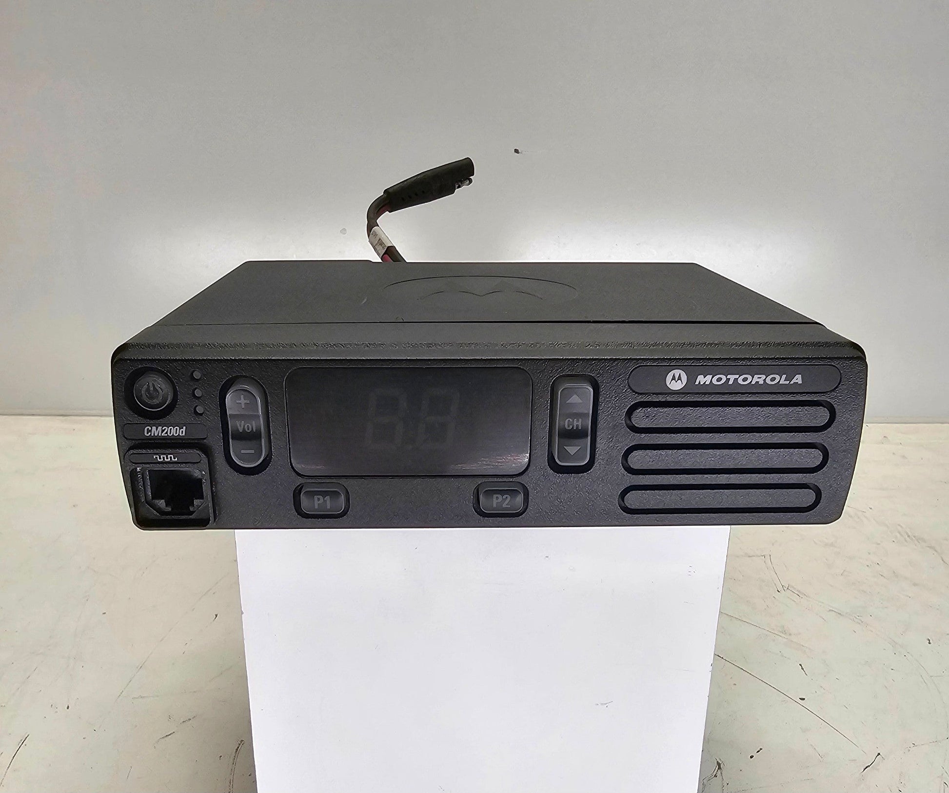 Motorola CM200D UHF Analog mobile, model number AAM01QPC9JC1AN. This unit is a 40 watt, 16 channel radio with a band split of 403-470 MHz. Unit comes complete with power cable, bracket, and palm microphone.