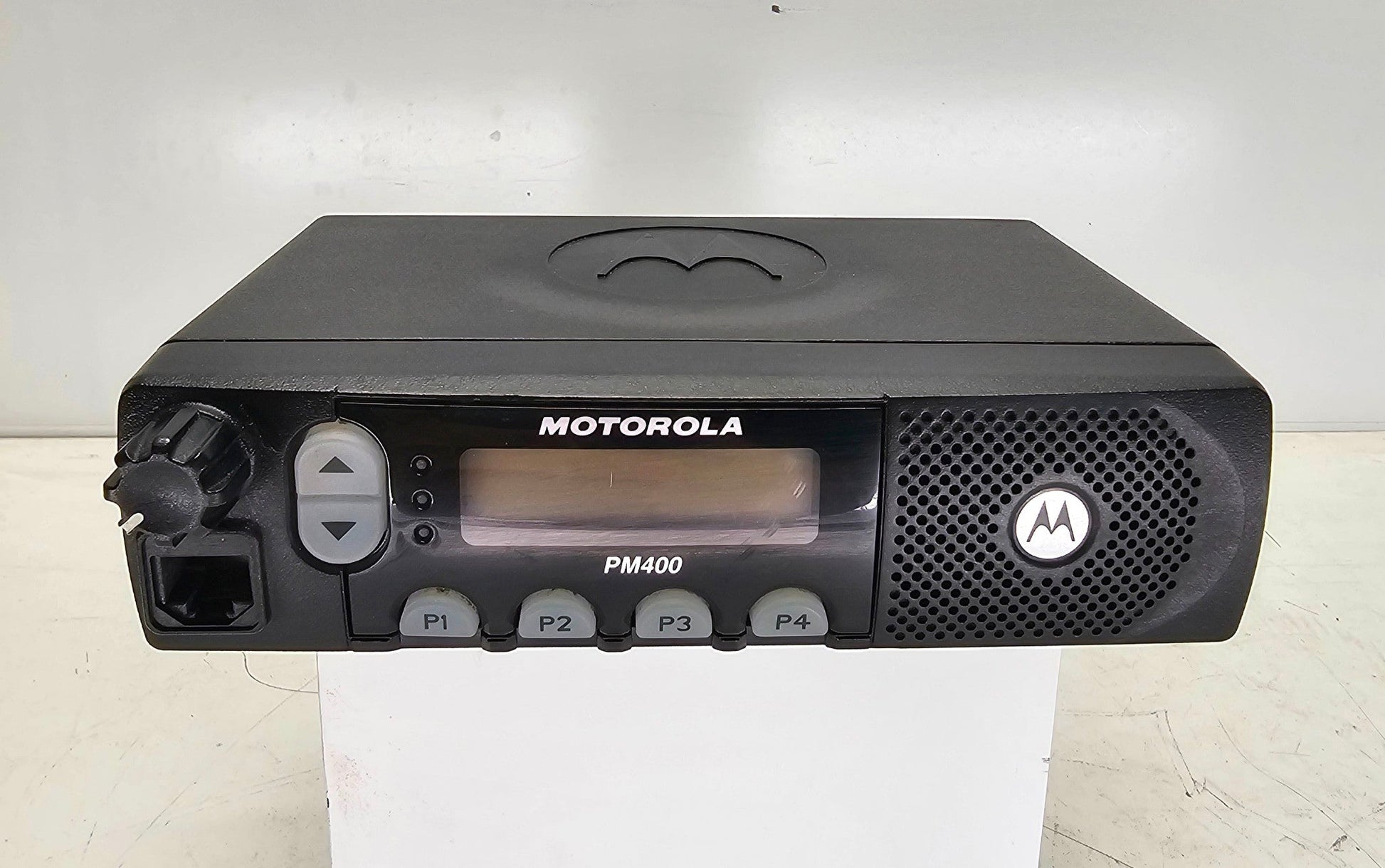 Motorola PM400 UHF mobile, model number AAM50RNF9AA3AN. This is a 25 watt, 64 channel radio with a band split of 438-470 Mhz. Unit comes complete with new power cable, bracket, and palm microphone. Free programming is available (1-16). If you have any additional questions please contact us - Mon-Fri (8am-4pm MT).