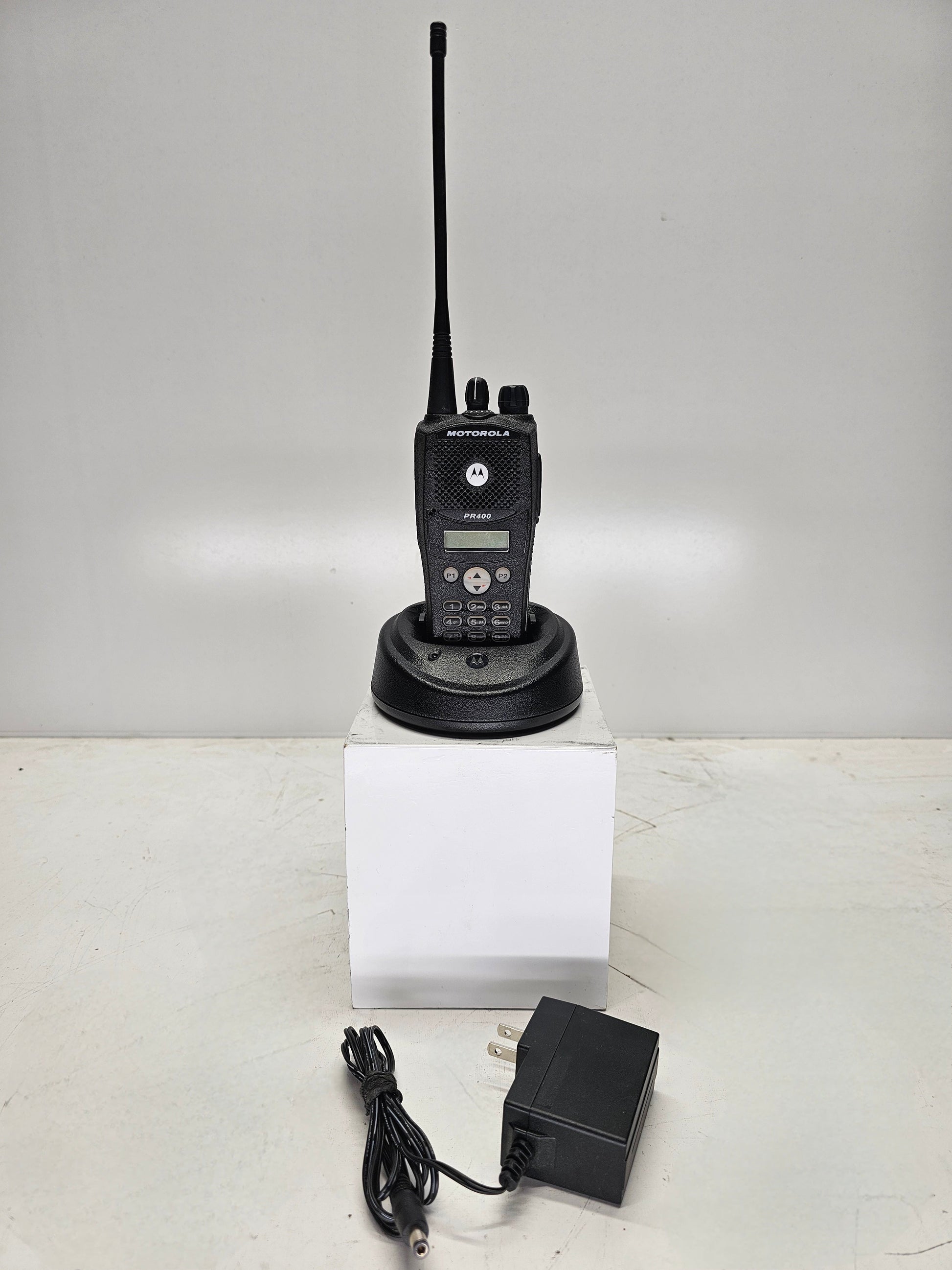 Motorola PR400 UHF full keypad radio, model number AAH65RDH9AA4AN. This is a 4 watt, 64 channel radio with a band split of 438-470 Mhz. Unit comes complete with antenna, battery, belt clip and rapid charger. Free programming is available up to 16 channels. If you have any questions please contact us - Office Hours M-F (8-4 pm) Mountain Time