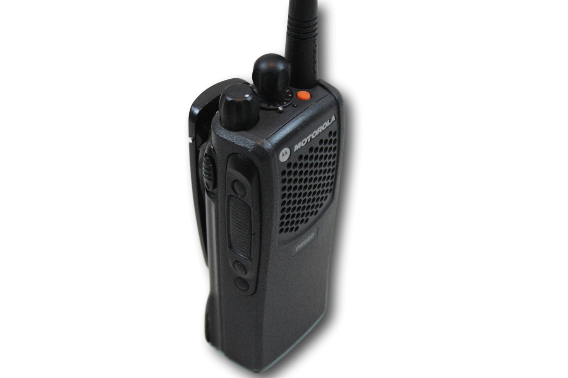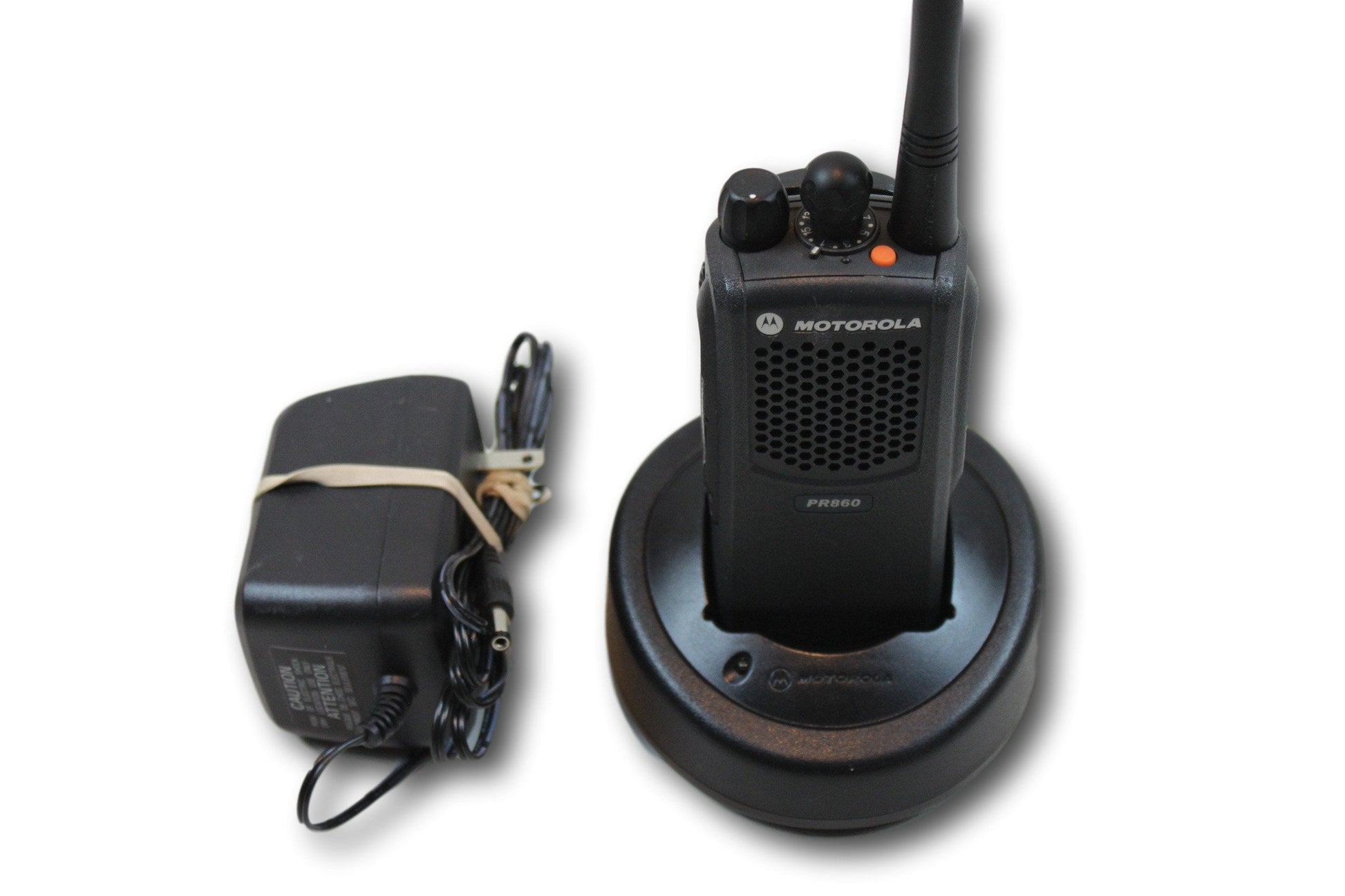 This is a Motorola PR860 UHF portable radio. This unit comes complete with antenna, battery, belt clip, and rapid charger.