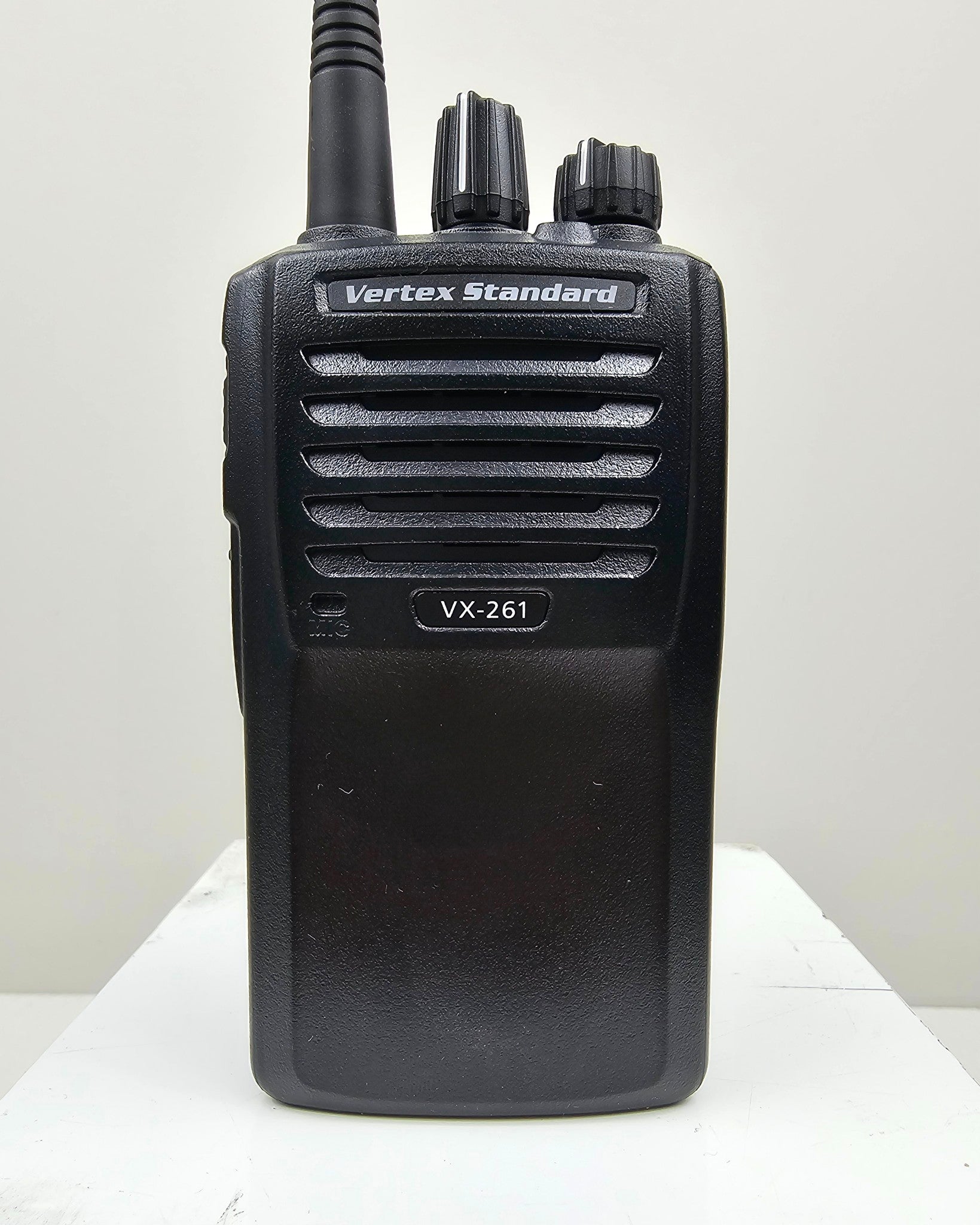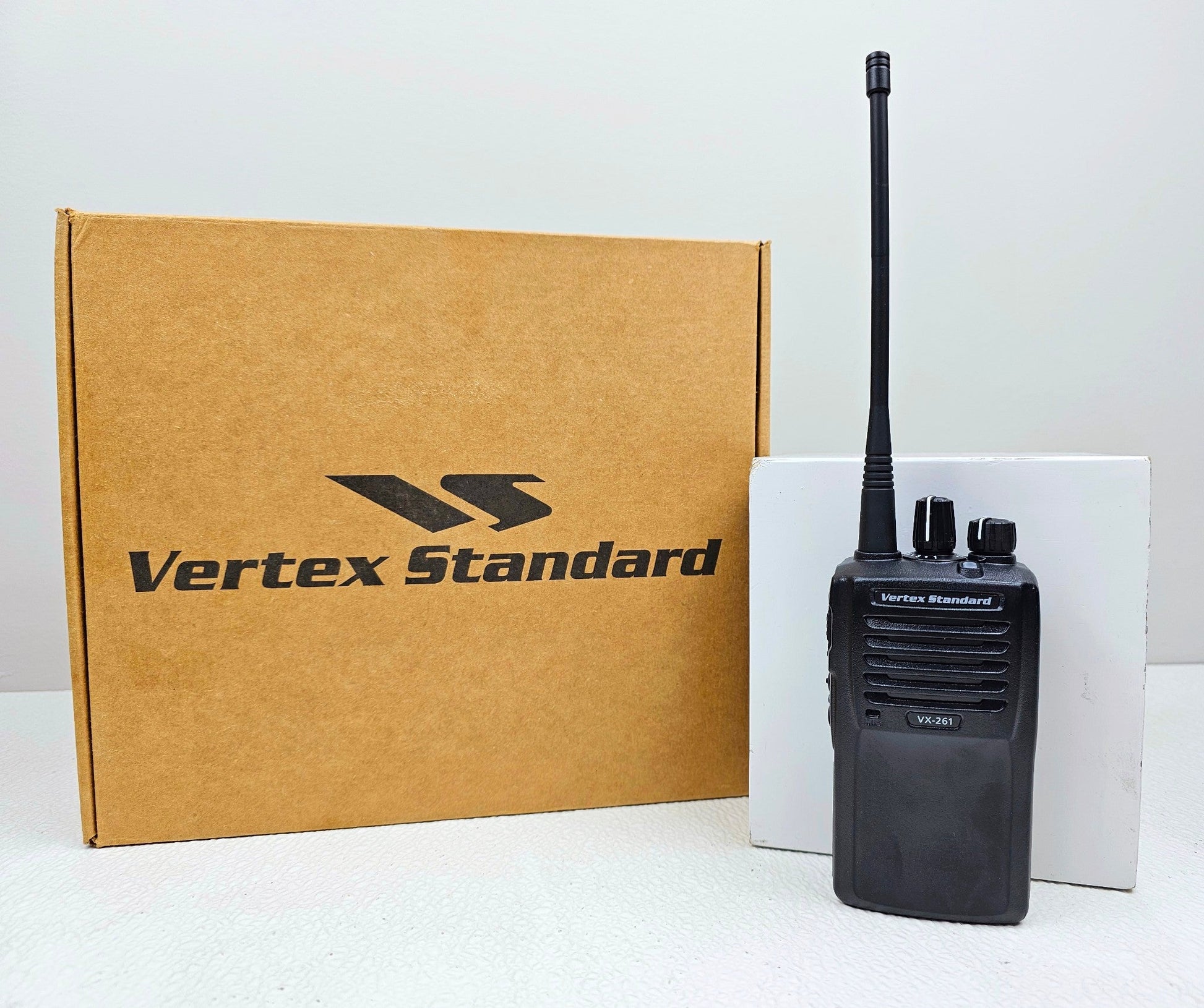 (NEW IN BOX) Vertex UHF radio - model number VX-261-G6-5. This is a 4 watt, 16 channel radio with a band split of 403-470 MHz. Radio is in great condition and guaranteed fully operational. Unit comes complete with antenna, battery, belt clip and charger. Free programming is available (Up to 16 Channels). If you have any questions please contact us (Mon-Fri, 8AM-4PM) Mountain Time.