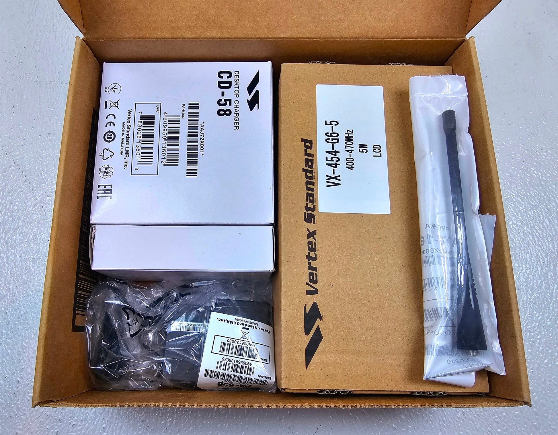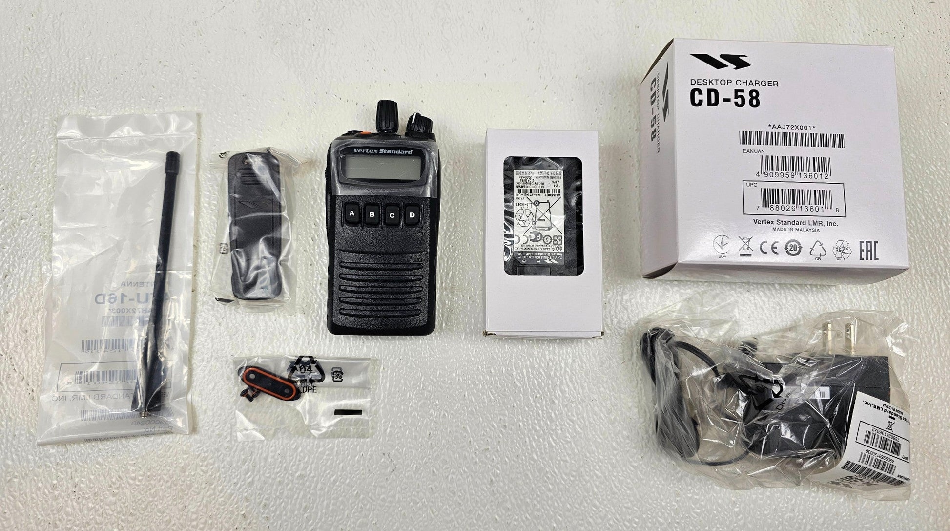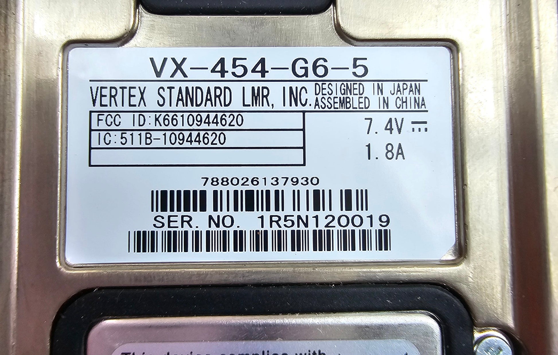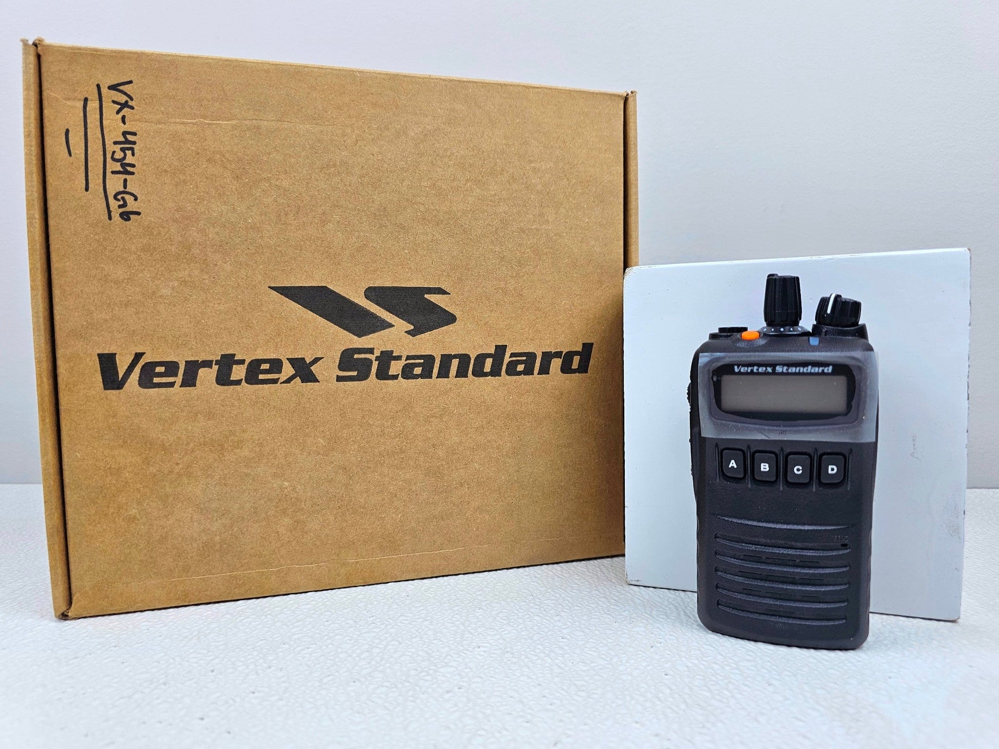 NEW Vertex VX-454-G6-5. These are 5 watt, 512 channel radio with a band split of 400-470 MHz and are Intrinsically safe. Units are new in box and come complete with antenna, IS battery, belt clip and rapid charger. These units can be programmed for both wide band and narrow band operation. Free programming is available (Up to 16 Channels). If you have any questions please contact us (Mon-Fri, 8AM-4PM) Mountain Time.