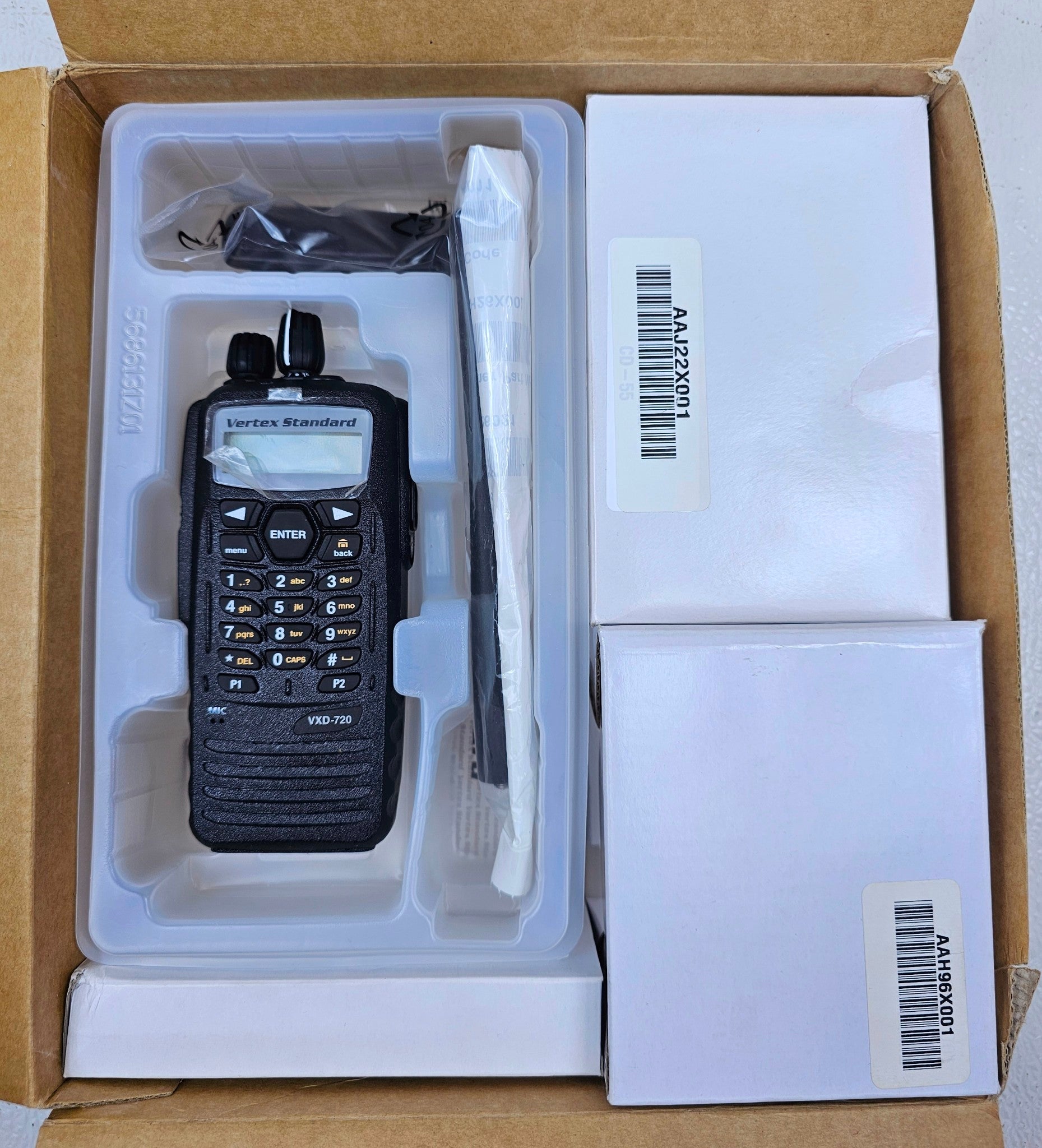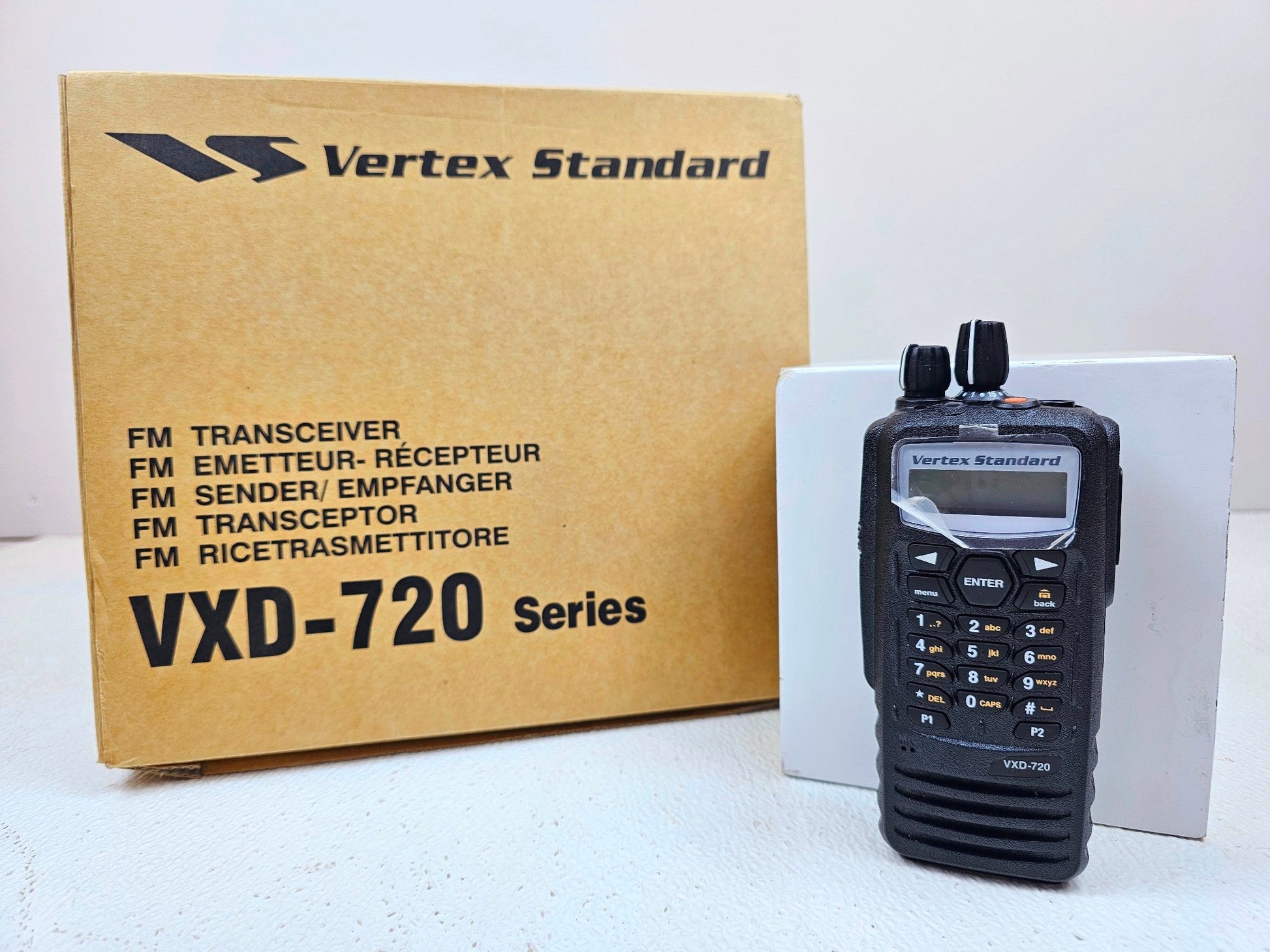 The VXD 720 is available in VHF (5W/1W) and UHF (4W/1W), with 512 channel capacity. It features five programmable keys, a 40 character alphanumeric display, tri-color LED custom call alert and VOX. It also includes a contact list with the ability to store up to 1,000 records, radio-to-radio cloning, and basic privacy in digital mode.