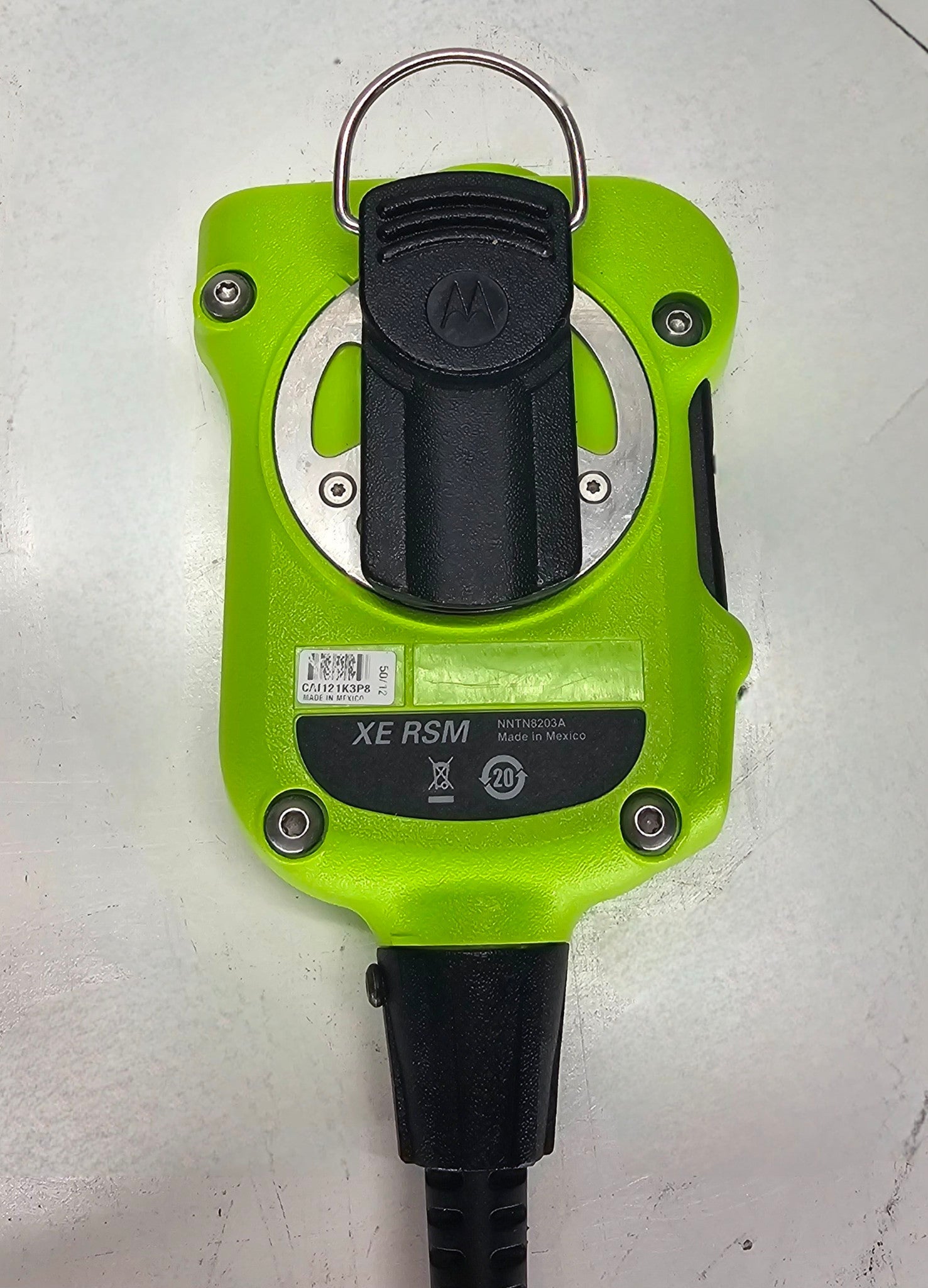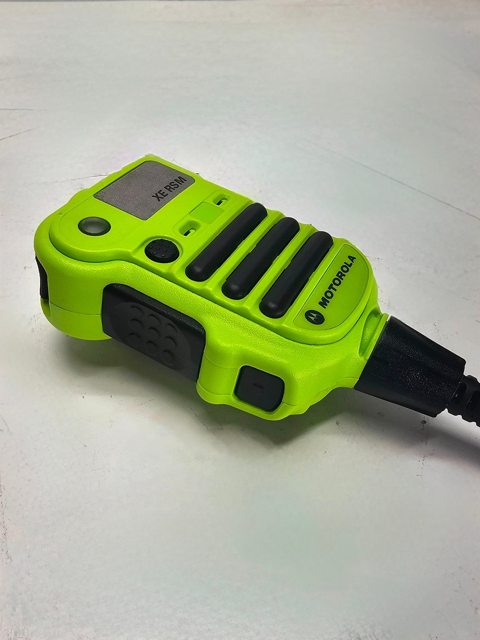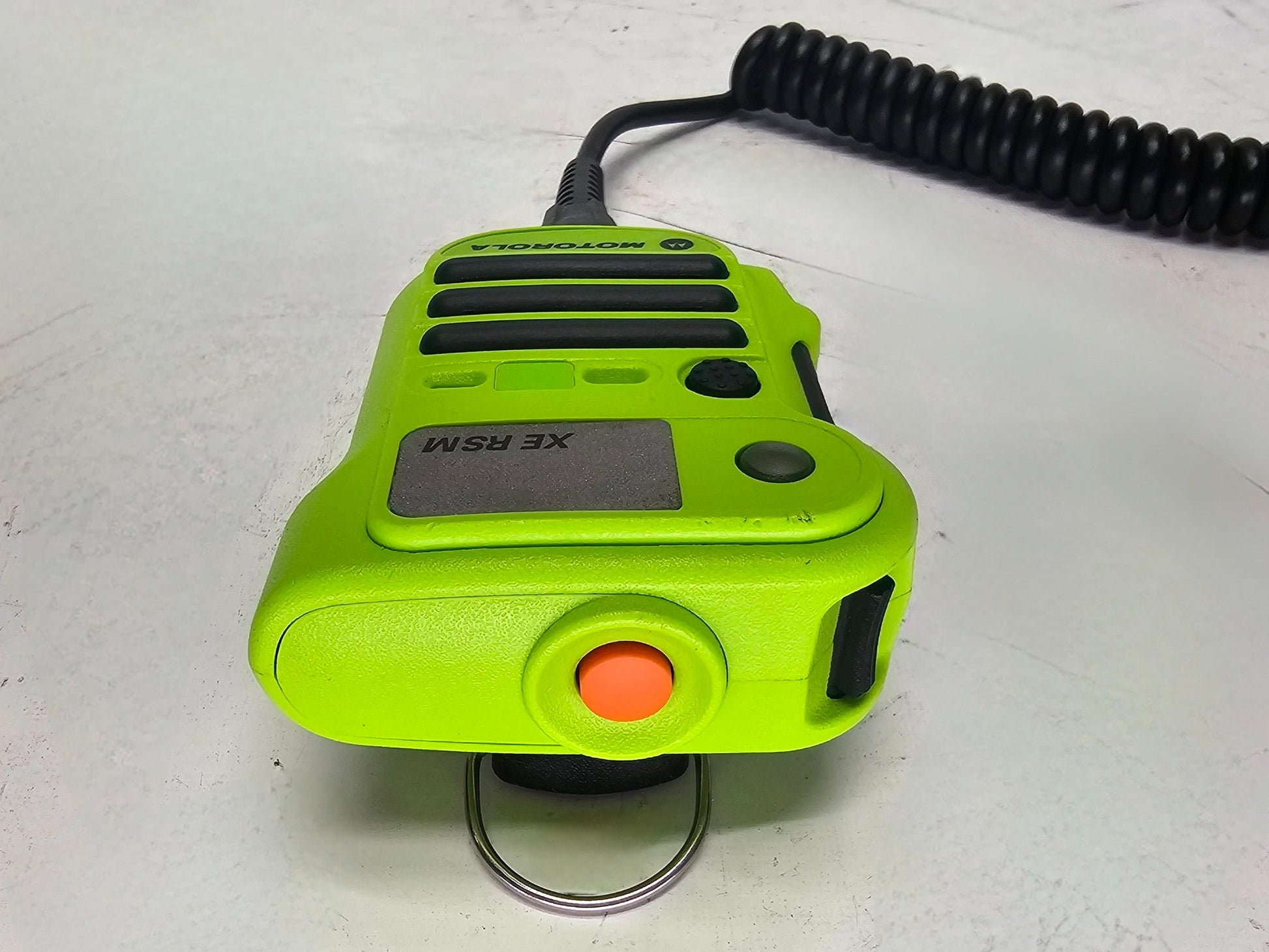 This high-visibility, bright green XE RSM features an asymmetrical shape to help you easily find the controls. The XE RSM features a large push-to-talk button and an extra-large emergency button, they are shielded so they're not set off accidentally.