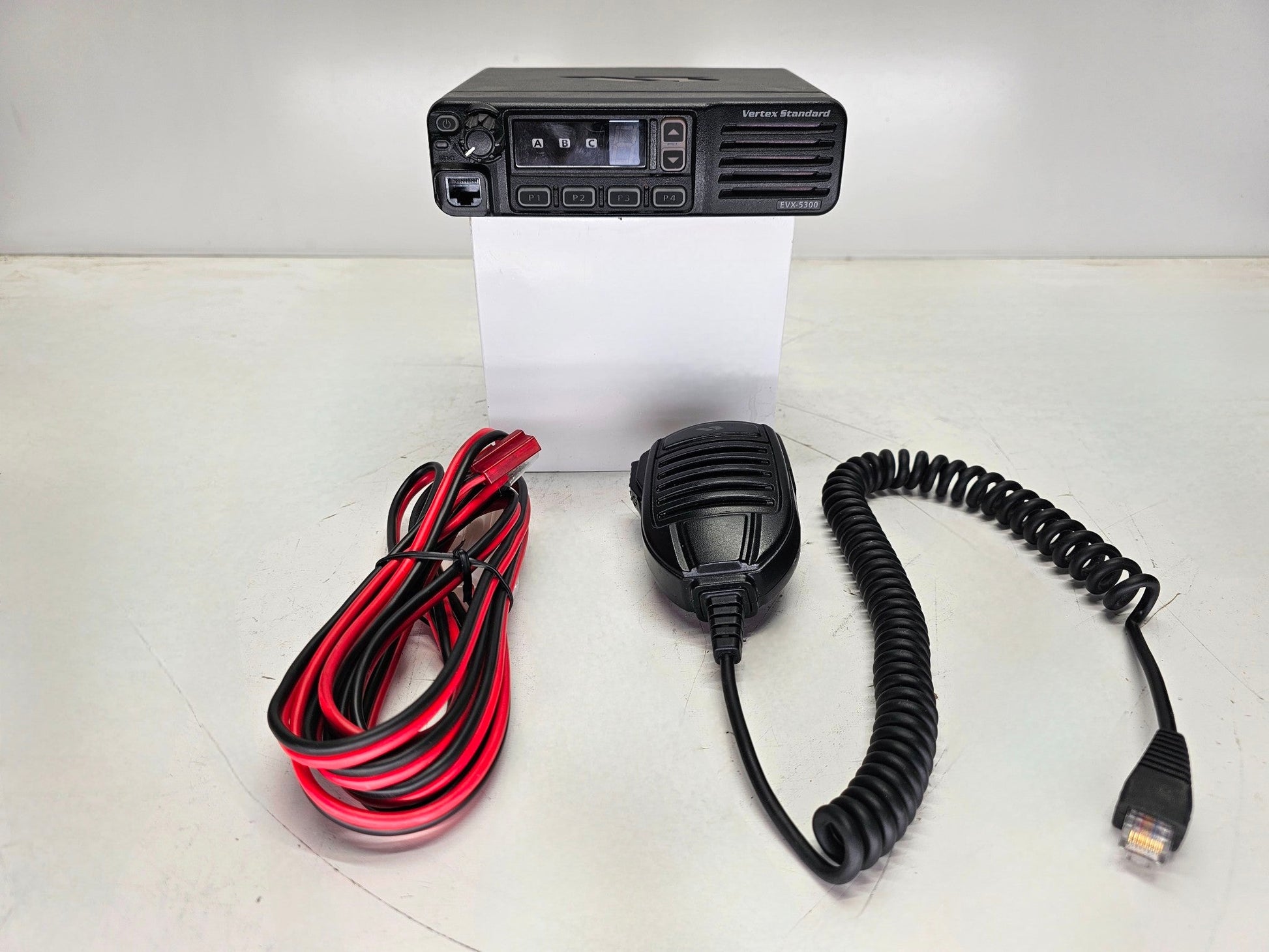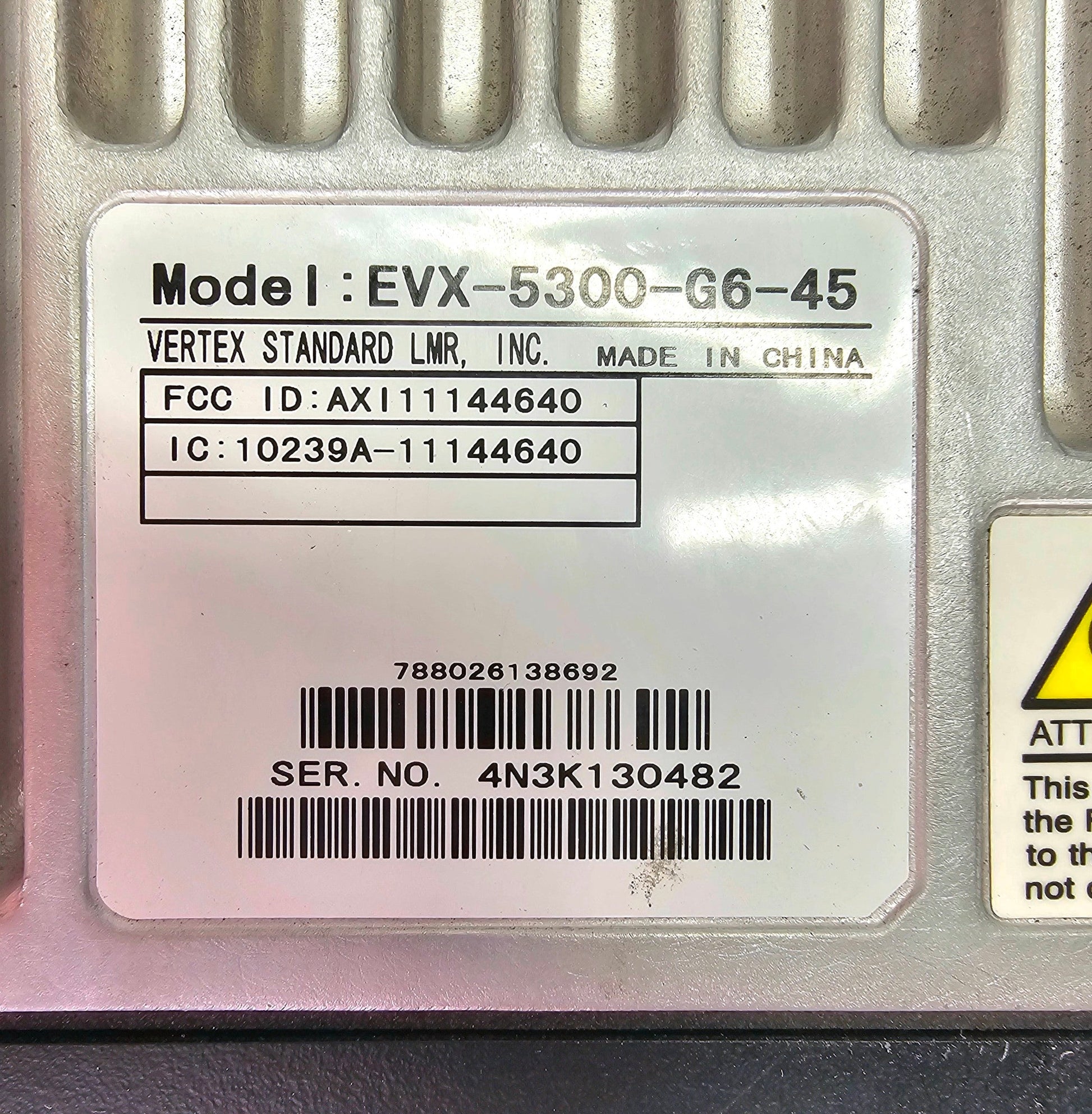 Vertex EVX-5300-G6-45 UHF 403-470 MHz Digital & Analog radio. This unit is an 8 Channel 45W Mobile Radio that is in great condition and guaranteed fully operational. Radio comes with palm mic, power cable and bracket/screws. We will program up to 16 Channels for free. If you have additional questions please contact us ( M-F, 8am-4pm MT).